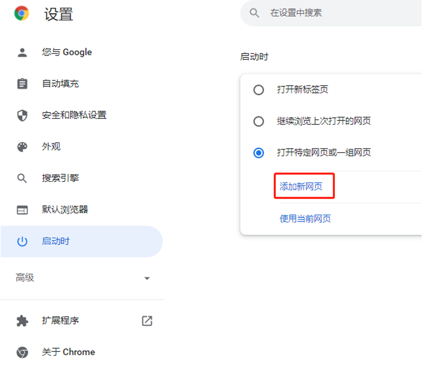 3、找到“启动时”,点击“打开特定网页或一组网页”。