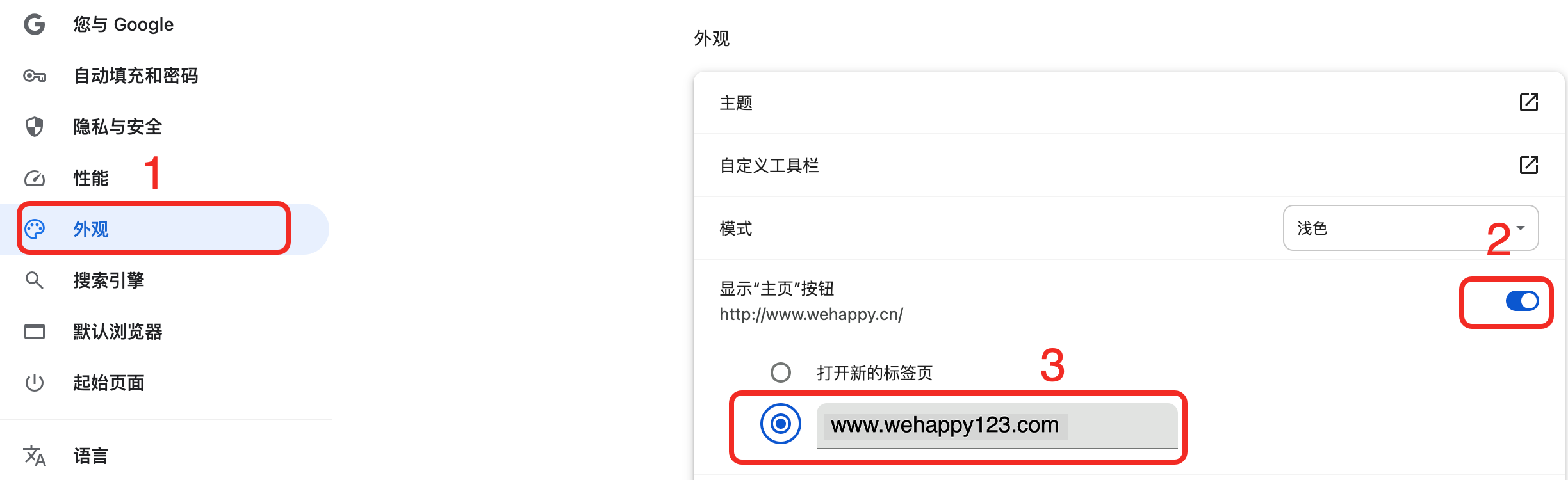 另外,还可以在“外观”下,开启“显示主页按钮”,然后输入新的网址。