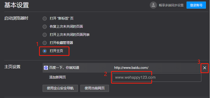 3、进入设置界面可以看到“基本设置”选项这里有一个“主页设置”。把主页设置为你想要的网址。然后设置浏览器启动时选中“打开主页”。