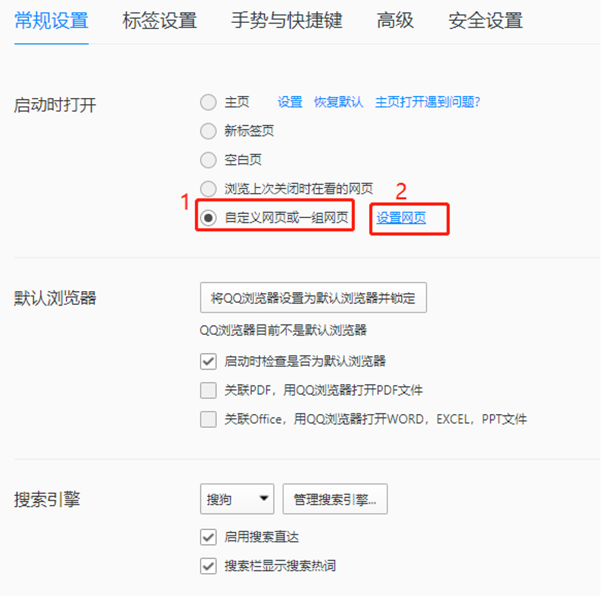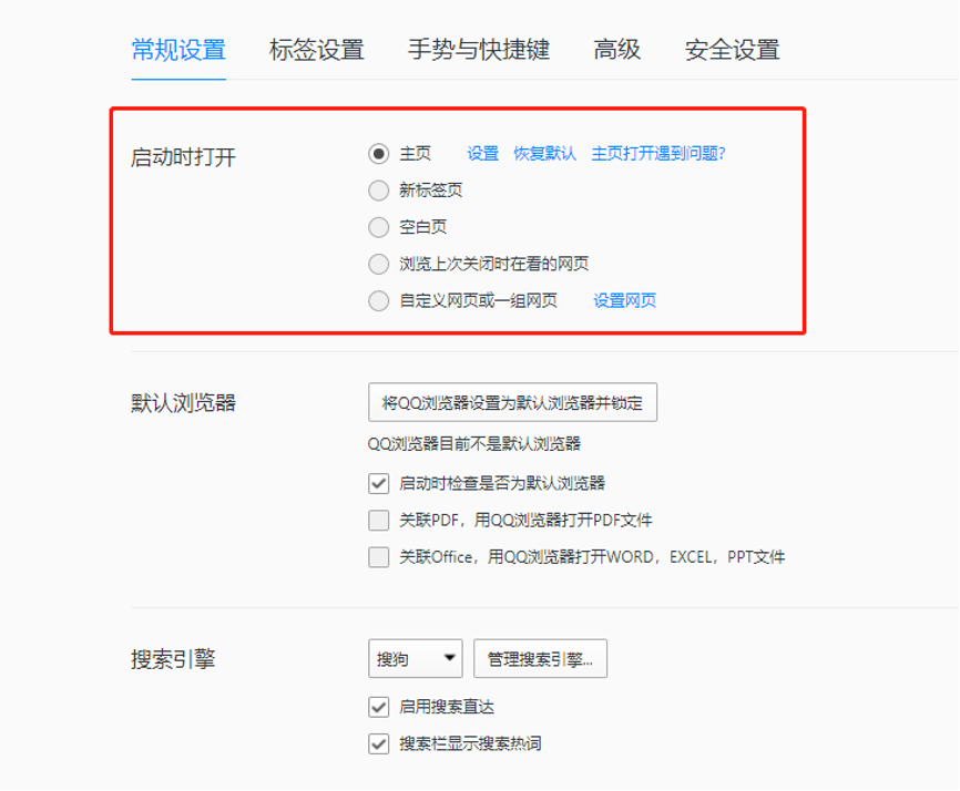 3、在设置中常规设置下,第一栏就是启动时打开主页选项,有多种选项选择:新标签页、空白页、自定义网页。