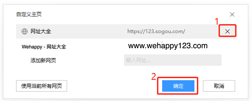 6、点击小叉子,将原来的网址删除,最后点“确定“